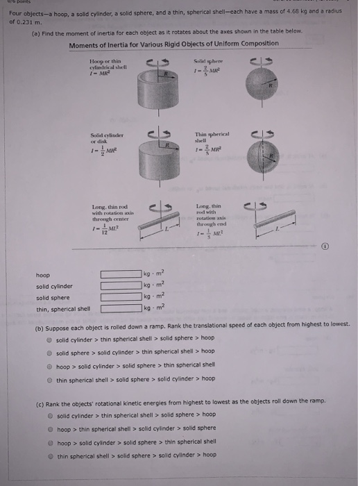 Solved Four Objects Hoop Solid Cylinder Solid Sphere And Thin Spherical Shell Each Have Mass Of 5 11 Kg Ad Radius Of 0 246 M A Find The Moment Of Inertia For Each Object As